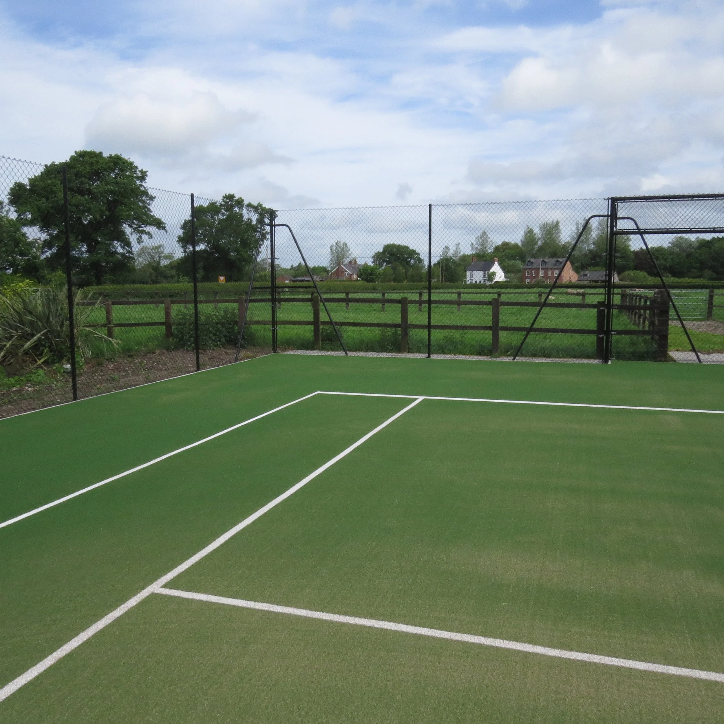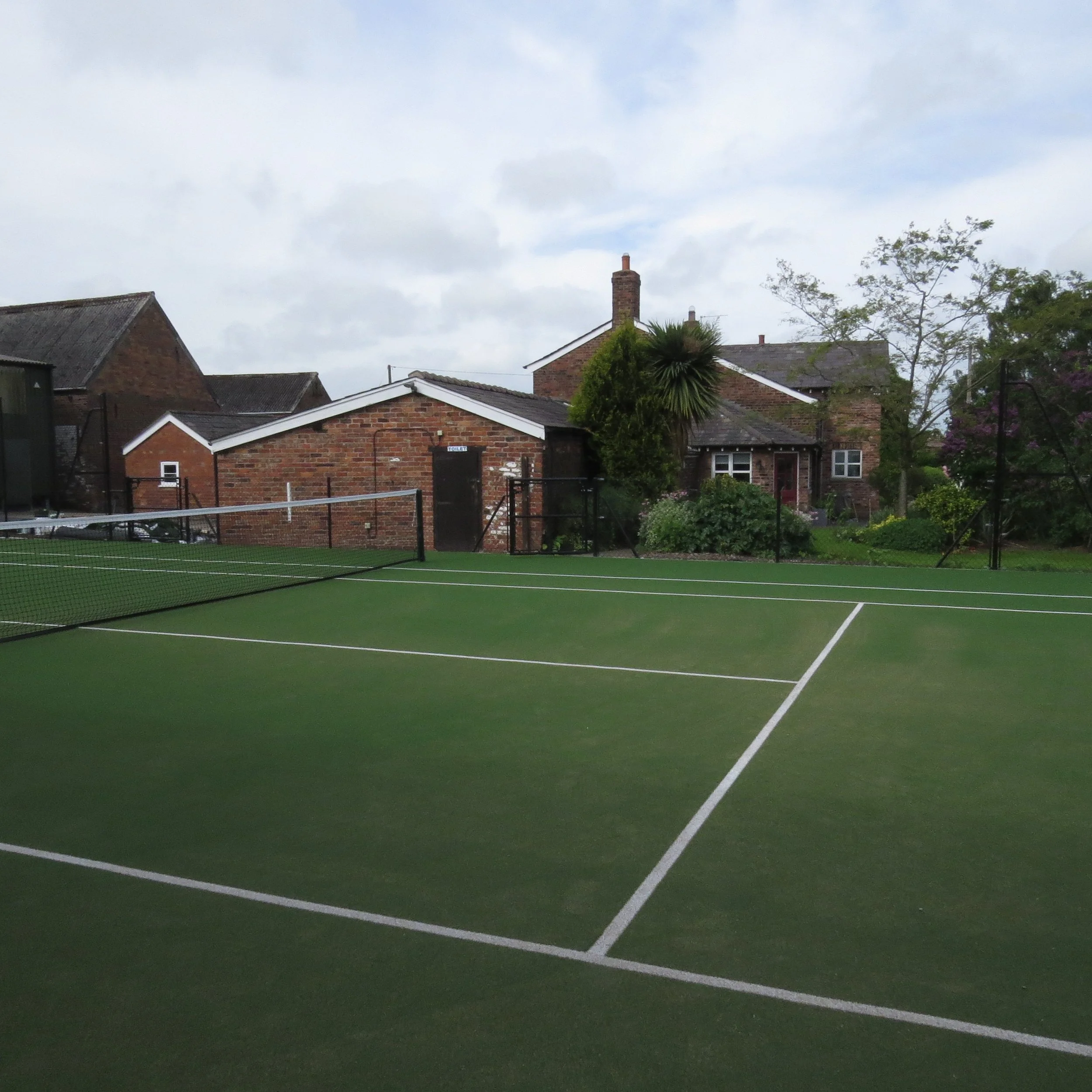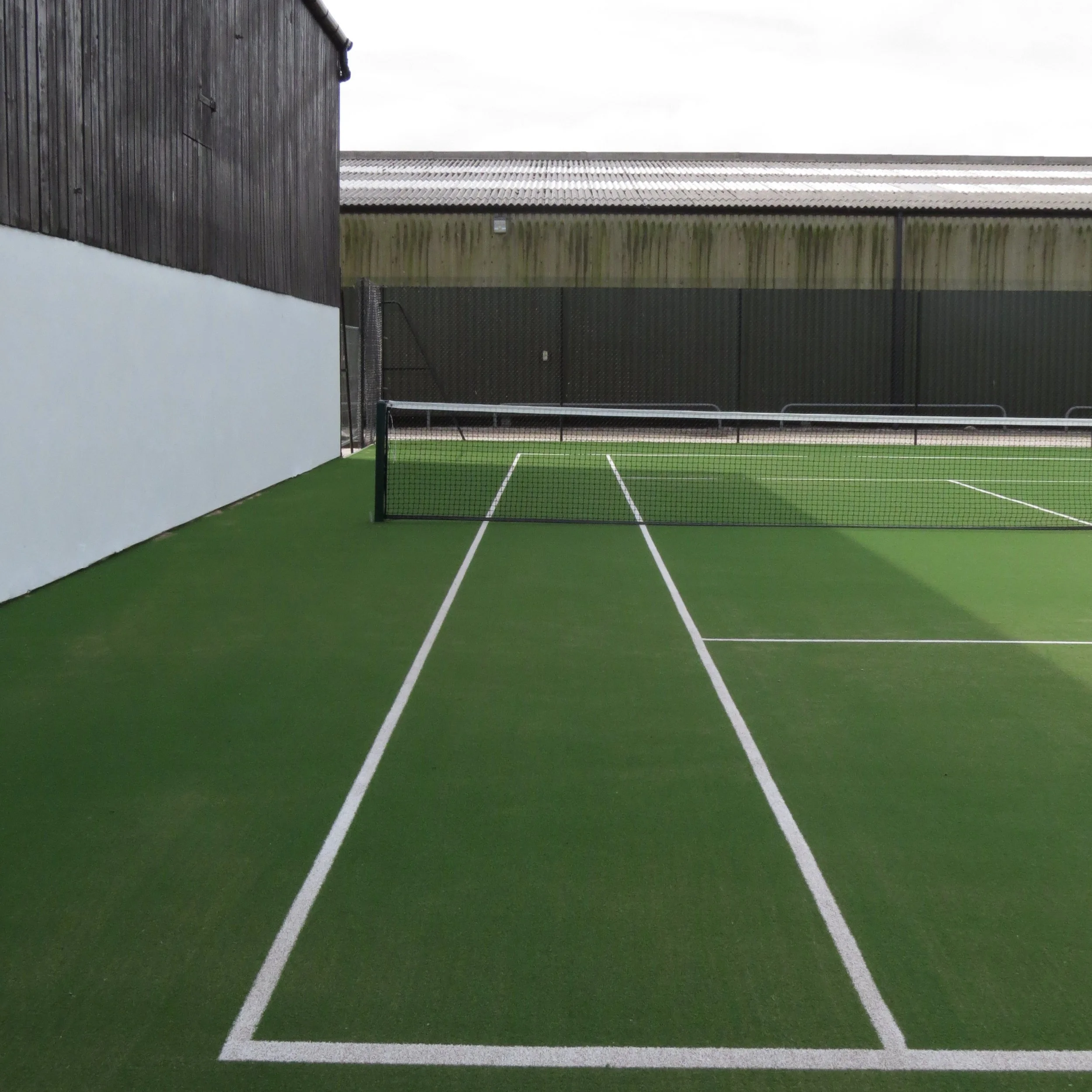 Workshop design studio (with support from Emery Planning) devised a solution that utilised some underused and overgrown side garden space and removed part of an existing stable to accommodate the 32m x 16m court in close proximity to the house. Plain green astro turf was selected to replicate the grass surrounding the garden and minimize the impact of the large court; black fencing was chosen to maximize translucency and again reduce the visibility of the court on the surrounding house and farm buildings.